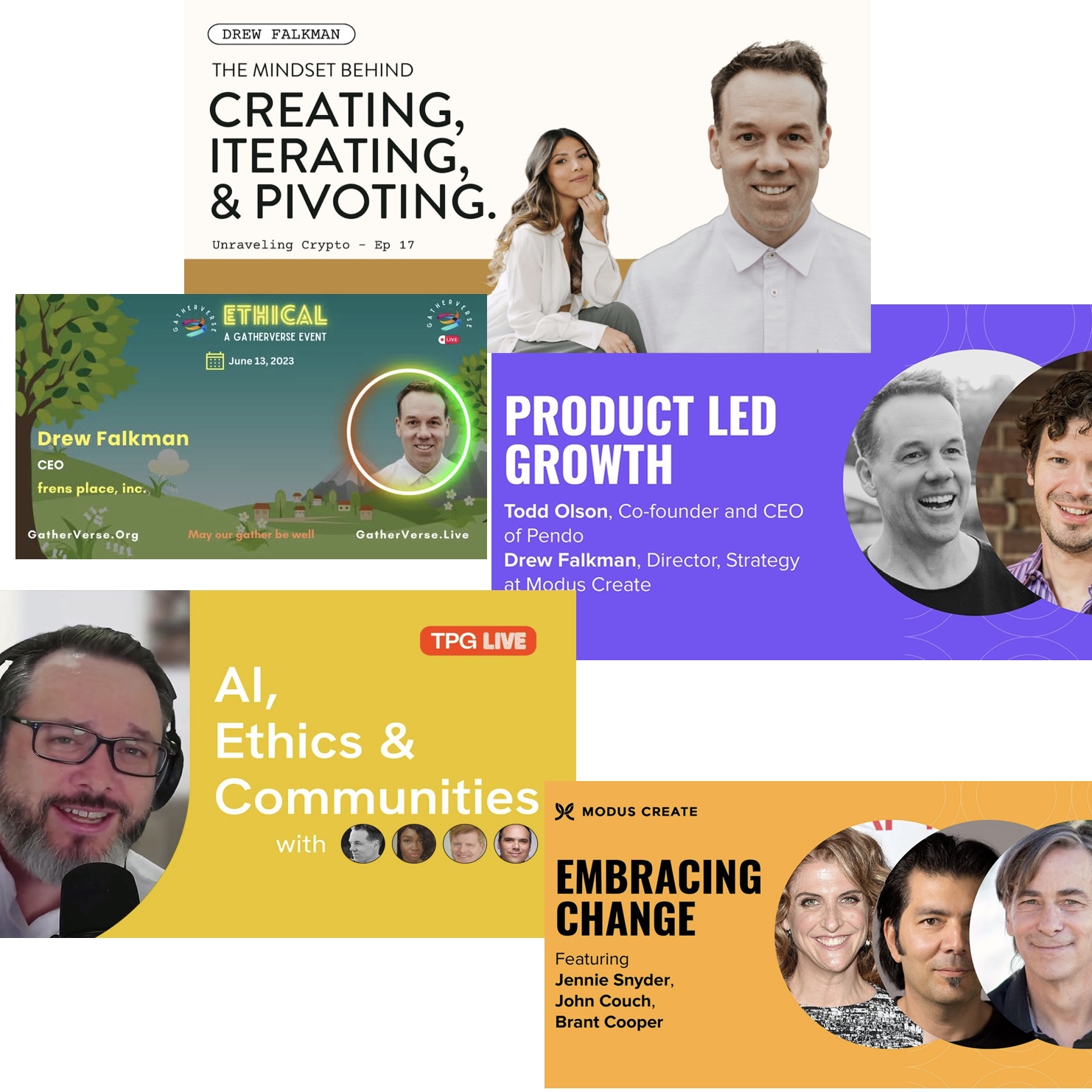 Drew Falkman has extensive speaking experience, both online and off. Hire Drew to moderate your panel, give workshops and talks on AI/product/leadership, or be a guest on your podcast.